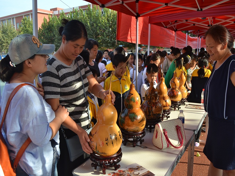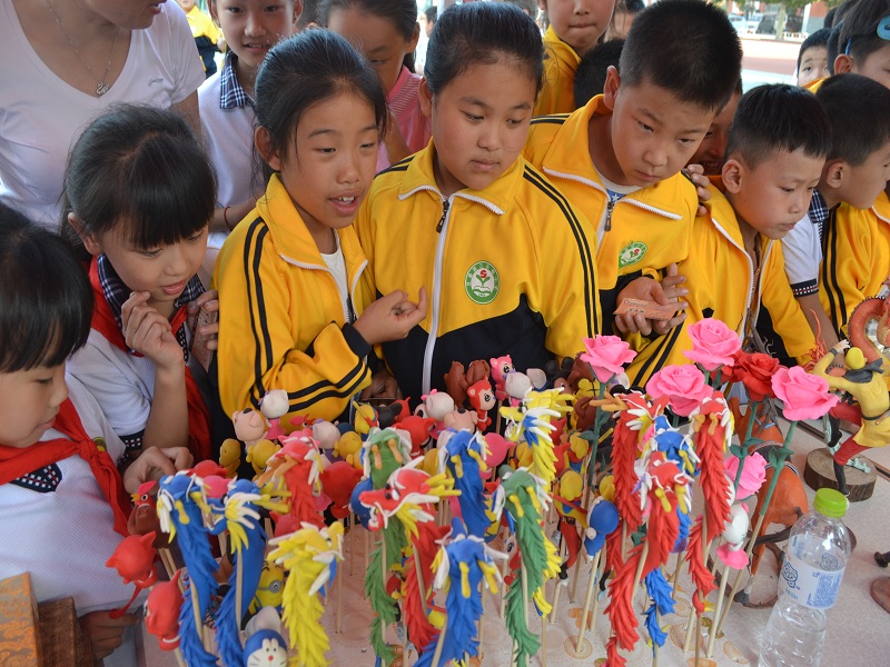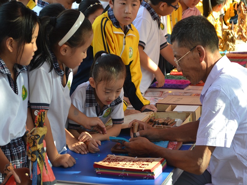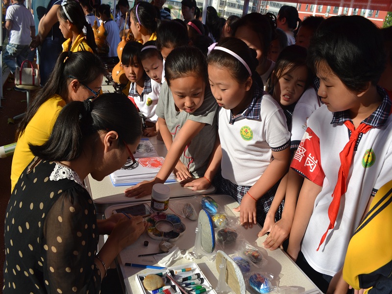 此次活动中,莒县有代表性的剪纸、面塑、核雕、玉雕、木雕、昆塑、糖画、布老虎、石头画、彩绘葫芦、制砚、金银器等共十多个非物质文化遗产项目参加了展示传授。带有浓郁地方色彩的“门签”,造型别致的木雕,构思巧妙的的剪纸,色彩艳丽的面塑,栩栩如生的石头画,古朴典雅的砚台,喜庆吉祥的彩绘葫芦……一件件作品,美不胜收。艺术与自然融合所呈现出的独特美感,色彩与线条搭配所带来的视觉冲击,匠心独具的艺术造型所产生的审美意蕴,令孩子们惊叹不已,让他们充分感受了莒文化的深厚底蕴,激起了他们对美的向往与追求。非物质文化遗产各个项目传承人还通过边讲解边演示,为大家呈现了作品的创作过程。孩子们围着艺术家们问这问那,想试一把的冲动溢于言表,在艺术家们的指导下,许多孩子过了一把“创作瘾”。